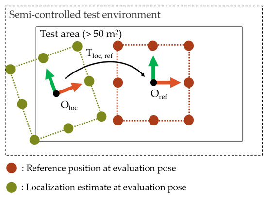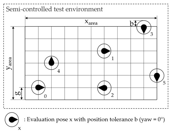 The heading of a localization system can have a significant influence on the localization accuracy. Hence, poses () are considered instead of points (). A path is defined by evaluation poses, which are traversed by the ELT one after the other. The suggested number of evaluation poses is one per square meter. This number is not fixed and should be adjusted to reach statistically significant results for the localization system, test environment, and the test and evaluation procedure. Guidelines for the selection of evaluation points are provided by de Poorter et al. [44]. The poses can be selected based on various criteria, such as random grid-based sampling or by defining an application-dependent path.