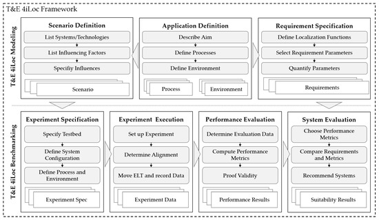 In the following, the T&E 4iLoc Framework is presented. Unlike existing methodologies for black-box system level, the T&E 4iLoc Framework is not designed for building-wide testing. Especially for RF-based systems, the building type, and structures are of great importance to the system performance. However, building-wide testing has the disadvantages of low reproducibility, comparability, and feasibility. In practice, test and evaluation of localization systems is often performed in test halls [19,20,21,22,23]. In this work, the term semi-controlled test environment is introduced as a category for test environments for T&E of indoor localization systems. Semi-controlled test environments are indoor facilities, such as test halls, large rooms, or large open spaces in a building, which provide an open test area with a modifiable environment. There are usually various constraints on the control of the environment, such as the facility itself, the available objects, or the deployment of system infrastructure. It is assumed that in semi-controlled test environments, T&E can be performed with some degree of similarity in terms of factors influencing the system performance. A major challenge for T&E in such environments is to produce results that are meaningful to both system developers and users. The following guidelines were established to incorporate the results from the previous analysis of test and evaluation (Section 2) into the T&E 4iLoc Framework.