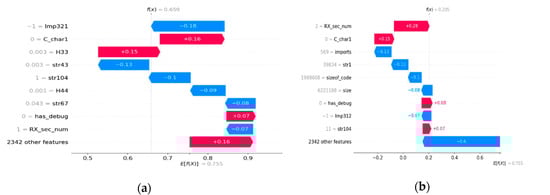 Figure 6 shows waterfall plots for a sample in each category of FP, FN, TN, and TP as predicted by the trained XGBoost ML model. The waterfall plot identifies the top nine features with name and their contribution in shap value. The feature name can be referred to in Table 2. Figure 7 shows waterfall plots for a sample in each category of FP, FN, TN, and TP on a probability scale. The probability scale value is computed using the algorithm in Algorithm 1 from shap values of top features. The last bar in the waterfall plot shows the contribution of the remaining 2346 features out of 2351 features. All of the feature’s probability values can be summed to the predicted value by the ML model. The top left waterfall plot in Figure 7 is for a FP sample. The sum of all features is 0.659 (more than 0.5) and the label for the sample is benign. Hence, the prediction is FP. The top right waterfall plot in Figure 7 is for a FN sample. The sum value is 0.205 (less than 0.5) and the label for the sample is malware. Hence, the prediction is FN. Figure 7 lower row waterfall is for a TN and TP prediction by the ML model with sum value 0.013 and 1.