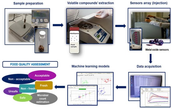 Recent advances in technology have made it possible to simulate the human senses such as smell and taste, for the purpose of sensory evaluation and determination of food quality and safety. The developed instrumental techniques are known as the electronic nose (e-nose) and electronic tongue (e-tongue). These techniques are either based on sensors that are equipped with chemosensitive materials to interact with specific substances or on bioelectronic devices (bioelectronic nose and tongue) with molecular recognition elements that can mimic the olfactory and taste systems [84]. In addition, e-nose and e-tongue (and their bioelectronics counterparts) can assess the VOCs (odorant and malodorous) in a relatively short time and following a simpler methodology compared to more complex systems such as GC-MS [85,86]. Putting things into context, e-nose and e-tongue are not able to replicate the human smell and taste but can gain ground on them by detecting also non-odorant compounds, therefore providing a useful approach with broad applications [85]. An e-nose system is usually constituted by gas sensor arrays (e.g., metal oxide semiconductor (MOS) gas sensors), while chemical sensor arrays (e.g., potentiometric) constitute an e-tongue [87]. E-nose measures the volatiles in the headspace of a sample, whereas the e-tongue detects the non-volatile compounds of a liquid sample [88] (Figure 2).