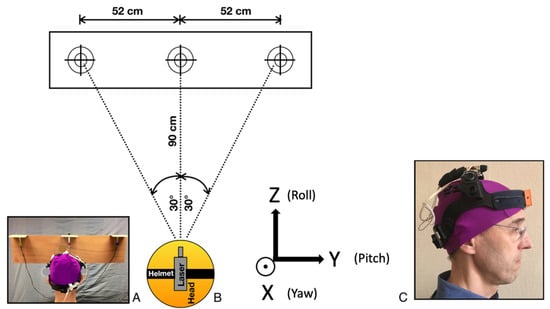 Description of the DidRen laser test. (A) Rear view of head position in front of the targets. (B) Schematic top view of the experimental setup with the three photosensitive sensors. The reference frame of the sensor is displayed when the head is in rest position. Coordinate system used in the study is also shown with the yaw (X-axis), pitch (Y-axis), and roll (Z-axis) rotations of the head during the test. (C) Helmet worn by an HCP (here RH) with laser on the top of the head and DYSKIMOT inertial sensor on the forehead.