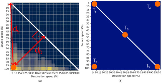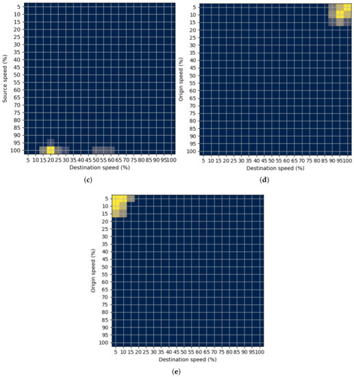 The STM can be represented with the expression:where represents the STM between edges and observed in the time interval . Indexes m and n represent relative traffic speeds with discrete values of 5% relative to the 100% as the maximal possible relative speed, which represent the respective speed limit. This process resulted in matrix dimensions of 20 × 20. There are five examples of the characteristic STMs on the motorway visually represented in