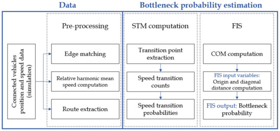 Figure 2 with three main steps. The first step is data preprocessing, which includes simulated vehicle position data preparation as input for STM computation. For every vehicle, its route is extracted with corresponding relative harmonic speed values, and it is matched to the corresponding edge. The second step includes the computation of the STMs, which represent the speed probability distribution for every vehicle travelling between two consecutive edges. Then, the last step includes FIS for bottleneck probability estimation with input variables computed as CoM distances from the origin and diagonal of the STM, respectively.