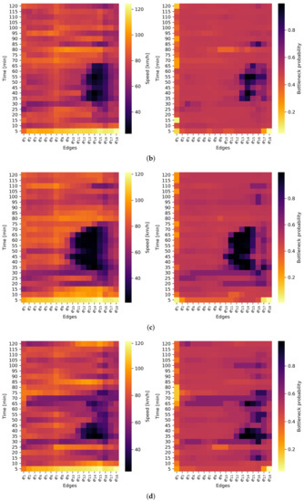 Figure 1a shows the more unstable traffic state because vehicles have speeds close to 60% of the speed limit. This event can indicate the start of the congestion, but it cannot represent the start of the bottleneck regarding the relatively high speeds.