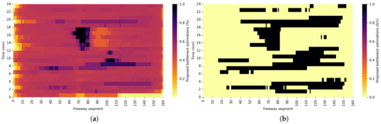 Alongside the advantages and presented application of the proposed method, some considerations must be addressed. The method is evaluated on a dataset produced with simulated CVs on the motorway. Currently, all vehicles are not connected and integrated into one communication system. Accordingly, the method could be evaluated on a dataset, which contains mixed traffic flow (containing CVs and not connected vehicles) to be applicable to the current motorway scenarios. On the other hand, speed is used as the only traffic parameter for bottleneck detection. Introduction of several more transition matrices containing parameters like density or traffic flow could increase the accuracy and reliability of the method’s result in more versatile motorway traffic scenarios. Final consideration when using STMs is the trade-of between the time interval of data collection for one matrix and the traffic pattern accuracy, represented by the STM. The depends on the type of the research that is conducted. For macroscopic considerations, like traffic state estimation or finding the anomalies in large datasets, interval can be set to more wide range, with intervals of one hour or larger. In this case, many different traffic patterns are captured by the STM, but the most dominant can be extracted. On the other hand, if the research is related to micro scale like traffic control on highway or intersections, should be set to a minutes scale. In this paper, the interval was set to 5 min, which was used for STM data collection, and is appropriate for bottleneck detection on motorways.