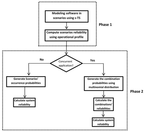 The proposed model has several activities, as detailed in Figure 1. These activities are divided into two main phases. The first phase illustrates the activities required for behavior modeling and scenarios’ reliability calculation. The second phase describes the scenarios’ combination mechanism and the determination of system reliability.