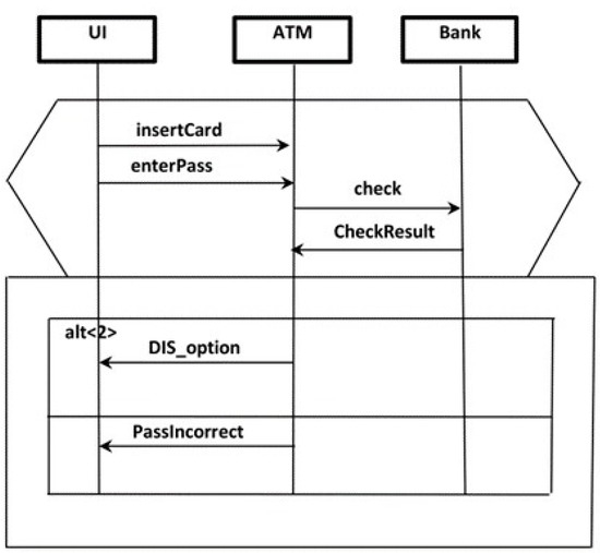 The password verification scenario of an ATM (shown in Figure 2) was selected as an ongoing example to illustrate the proposed model. As shown below in Figure 2, the chosen scenario consists of three components named UI, ATM and Bank. In addition, the scenario shown in Figure 3 of the automated railcar system [22,23,24] is also used in this section as a complementary ongoing example to illustrate the behavior modeling. However, in Section 3.2, the reset scenarios of the ATM will depict the calculations of scenario reliability. Furthermore, in Section 3.3, which illustrates the measure of system reliability, the ATM system is used to represent sequential software applications, and the railcar system is used for concurrent applications. For more clarification, Appendix A and Appendix B. contain the scenarios’ specifications and the related documents of the two case studies.