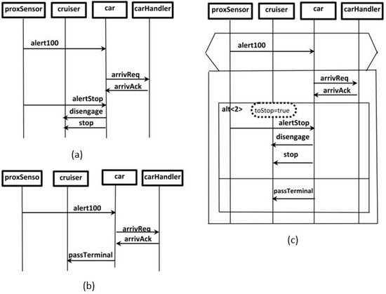 Figure 3. A portion of a railcar system case study is described in two sequence charts, combined by s-TS into one chart. (a) Simple sequence chart describing scenario of car approaching terminal with stopping at terminal. (b) Another simple sequence chart describing scenario of car approaching terminal with passing that terminal. (c) One s-TS combining the two scenarios described in (a,b).