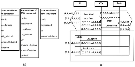 Figure A1. System specifications of ATM case study in form of s-TS. (a) Scenario of card insertion (scenario 1). (b) Scenario of incorrect password (scenario 2). (c) Scenario of display options (scenario 3).