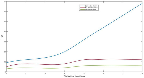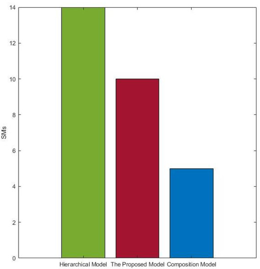 In Figure 6, the hierarchical model demonstrates the best performance regarding S s . In contrast, in Figure 7, the hierarchical model shows the worst performed regarding S M s . This result clearly confirms that the proposed model performs better than the selected models. Both factors that increase the computational cost, S s and S M s , have been taken into account. One of the main reasons for reducing S M s is using s-TS, which makes compact and concise scenarios. The hierarchical and composition models used the basic form of S M s scenario language, which has no similar properties to s-TS. Table 5 summarizes the results shown in Figure 6 and Figure 7.