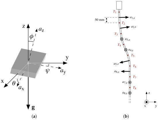 Figure 1a depicts a static configuration with gravitational acceleration vector applied to a tilted accelerometer. This acceleration of is referred to as 1 g throughout the remainder of this paper. A reference coordinate system () can be aligned with , such that the z-axis opposes . Any applied acceleration is measured by the accelerometer as a vector . Under perfect alignment with the reference system, g, but because of the inclination of the sensor, both coordinate systems are rotated by , , and . As illustrated in Figure 1a, these angles express the rotation between and the plane, and the plane, and and z, respectively. Basic trigonometry leads to Equations (1)–(3), which can be used to calculate , , and , from , , and [35].