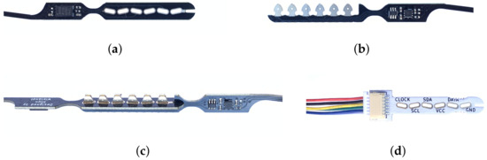 - Connector–cable–connector setups: This labor intensive, costly, and bulky solution is often found in prototypes and low-volume production devices [44]. Each sensor board has an incoming and outgoing connector soldered onto it, and all boards are connected with cable assemblies. The cost of the connector terminals, cable assemblies, soldering, and manual assembly easily exceeds the actual cost of the sensors.
