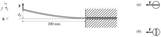 To evaluate the developed design, a series of mechanical and electrical tests were performed. First, we evaluated the flexibility of the probe. Figure 5 represents the test setup for this experiment: a probe is anchored and a force is applied 200 mm from the anchor point, causing a deformation . The force and deformation are measured in a horizontal plane to rule out any gravitational impact on . This experiment is performed in two configurations, taking into account the orientation of the sensor board in the studied 200 mm probe section. In configuration (a) is applied in the PCB plane, whereas (b) studies the deformation for a force perpendicular to the PCB plane.