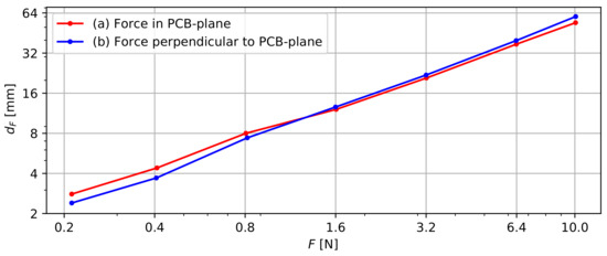Figure 8 presents the deformation of the probe by applying a force either (a) in the PCB plane or (b) perpendicular to it. A small force of N results in a considerable deformation (2.4 mm or 2.8 mm) of the studied 200 mm probe section. Increasing this force to 10 N results in an extreme deformation of the probe, but does not vary linearly with . Scenario (a) and (b) exhibit similar results, so the flexibility of the probe can be considered nearly isotropic. In scenario (a), a N force results in a slightly larger deformation than in scenario (b), which contrasts expectations. The logarithmic scale amplifies the apparent significance, but the absolute differences of these values are all ≤0.7 mm and could be caused by measurement inaccuracies.