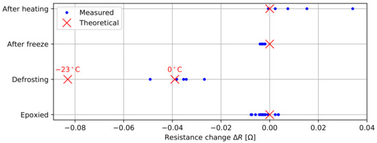 The next study evaluates the impact of different events on the trace resistances. For these tests, we find the average change in trace resistance (ΔR) per 200 mm probe section by—again—measuring the change over an entire 1.2 m probe. In a first test, we measure the change in resistance after filling the probe with the epoxy compound. Next, the probe is frozen for 6 h at , and the resistances are measured in the first 2 min of the defrosting process, as well as after temperature equilibration. In a different test, a probe is placed in an oven at to for six hours. For safety purposes, no resistance measurements were performed on the hot probe, but the resistances were reassessed when the probe was back at room temperature.