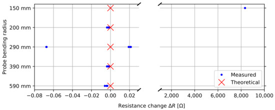 Figure 11 shows the connector’s performance as a function of probe bending. The average change in resistance is measured for each signal over a 200 mm probe section, as a function of bending radius. This test was planned to be destructive, determining the point of failure. The results show that no noticeable change in resistance is observed for a bending radius up to 390 mm. At 290 mm bending radius, some significant changes in contact resistance are observed, possibly due to settling contacts. The probe still performs well under a 200 mm bending radius, but under a 150 mm radius an average contact resistance of 8.333 kΩ is observed. This change became permanent after the experiment and represents the maximum measurement range for our setup (50 kΩ/6), so we can assume that one of the sensor boards snapped under this extreme bending. We can conclude from our tests that we are able to bend and reliably use the probe up to a bending radius of 200 mm, far beyond the expected realistic use case scenario.