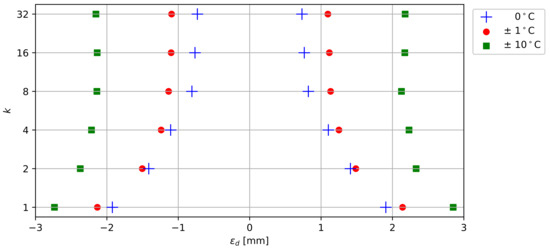 Deformation error () in function of number of averaged measurements (k) expressed as 2.5th and 97.5th percentiles for 0C, ±1C and ±10C temperature variations.