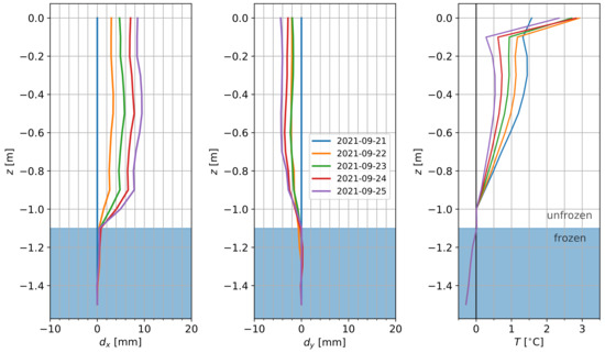Figure 14 shows the data acquired by a probe () deployed on the Seward Peninsula, AK in September 2021. For this probe, data from the first five days after installation showed movements of up to 0.01 m, with a clear slip plane at 1.1 m depth related to the interface between frozen and unfrozen conditions. The data show continuous deformation with almost constant deformation rates of about 2 mm/day between 0 and 0.6 m depth along the x-axis. This represents a significant displacement since it exceeds the 95% confidence interval for at C of mm/m. Below this, deformation rates decrease until 1.1 m depth, and deformations below that are negligible. Similarly, no distinct movement can be observed along the y-axis for depths below 1.1 m, whereas above movements of up to 5 mm over this five-day period were recorded. The temperature data show that below 1.1 m depth the soil is frozen, whereas above the soil is unfrozen.