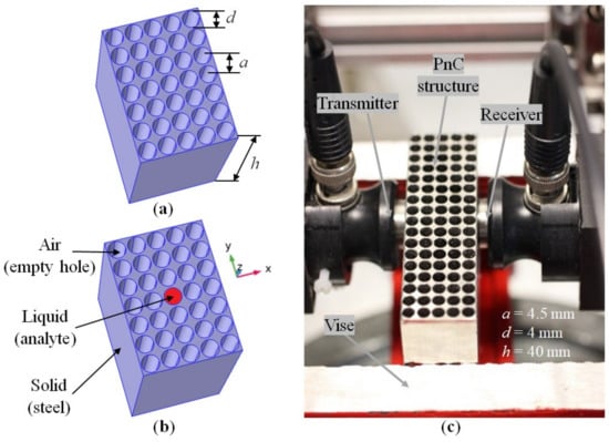 In this work, the object of study was a two-dimensional phononic crystal, which is a solid-state matrix with a periodic structure of identical cylindrical holes of diameter d and spaced apart at a distance a, forming a square lattice (Figure 1a). The block, which the phononic crystal was made of, has a considerable height (h >> d) in order to reduce the influence of boundaries and to bring the properties of the three-dimensional structure closer to a two-dimensional phononic crystal case. Filling the central hole of the PnC with a liquid will lead to a violation of the periodicity of the structure of the crystal lattice. It creates a so-called point defect (Figure 1b). Stainless steel was chosen as the phononic crystal material, since it meets the following requirements: first, the technology is advanced for mechanical processing, specifically for the realization of a periodic system of cylindrical holes; second, high values of the speed of sound and density, which guarantee a high acoustic contrast to the liquid; and third, the material has low mechanical losses.