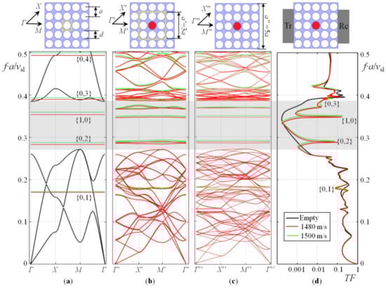 Band diagram for 2D infinite PnC (black curves) and isolated liquid-filled hole resonator eigenmodes for two different speed of sound values (green and red lines) (a); Band diagrams for 2D supercells PnC with a liquid-filled central hole for two different speed of sound values (green and red curves) with the lattice constants of a′ = 3a (b) and a″ = 5a (c); Transmission spectrum of the regular finite PnC and the PnC with a liquid-filled hole defect for the two different speeds of sound (d). TF is the overall acoustic wave transmission factor. The PnC filling factor, defined as πd2/(4a2), is 0.62.