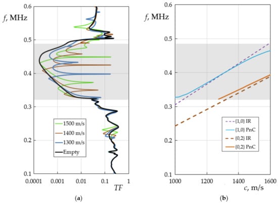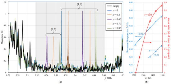 As noted earlier, the design of the phononic crystal was chosen in order to obtain the {1,0} mode within the PnC bandgap, which is true for a wide range of sound velocities in aqueous and alcohol solutions. As a result, isolated high-Q {1,0} peaks were obtained (see Figure 5a). Some of {0.2} modes for x = 0.66, 0.79 and 0.86 also fell into the band gap, but had a lower Q-factor. This allows us to distinguish them from the {1,0} peaks. Some of {0.2} modes for x = 0 and x = 0.2 are outside the band gap. They should be split and suppressed due to interaction with the eigenmodes of the steel lattice of the PnC and cannot be identified as individual isolated peaks. Since the low-frequency region of the spectrum to the left of the band gap is outside the optimal working frequency area of the PnC sensor as well as PZT transducers, they do not disturb the PnC sensor concept and have not been studied in detail.