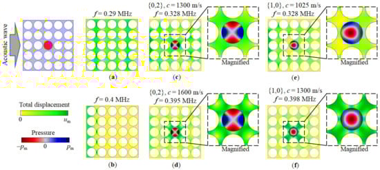 Figure 4 shows, for comparison, the two cases of the distribution of mechanical displacement fields for the PnC with a regular structure of empty holes (Figure 4a,b) as well as the one with the central hole filled with a liquid (Figure 4c–f). In the first case (Figure 4a), it can be seen that the acoustic wave passes through the PnC at the frequency of the transmission zone. Figure 4b proves that the structure reflects an acoustic wave incident from the left side onto the PnC at a frequency inside the band gap. In the second case, the two resonances are excited in the defect hole (Figure 4c–f) in the middle of the PnC sample. The distribution of liquid pressure in the defect hole corresponds to the second azimuthal {0,2} (Figure 4c,d) and the axisymmetric {1,0} (Figure 4e,f) modes. In one case, the sound velocities of the liquid are chosen so that the resonant frequencies of the vibrational modes of the defect are near the band gap edge (Figure 4c,e). In the second case, they fall into the middle of the band gap (Figure 4e,f).
