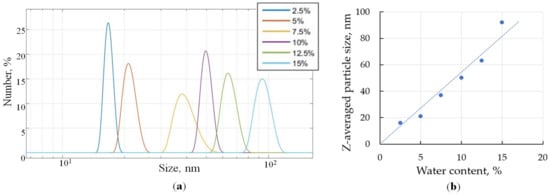 The z-averaged particle size is proportional to the water content of the WFE (Figure 6b). In accordance with the graph, the size of all the particles in each sample is located in a fairly narrow range. This range is the narrowest for a sample with a water content of 2.5%. As the water content increases to 7.5%, the width of the range increases. For samples with a water content of 10% to 15%, this range corresponds approximately to a sample with a water content of 5%. It follows from the DLS data that the uniformity of the hydrodynamic diameters of water particles in a water–fuel mixture nonmonotonically depends on the water content; the most uniform emulsions are achieved for less than 5% or more than 10% of water.