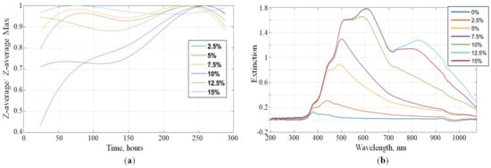 Graph of the relative change of the z-average time from the time of preparation (a) and spectral extinction of WFE samples with different water content (b).