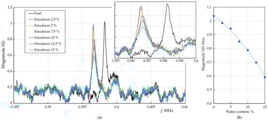 The study of the transmission spectra of PnC with a defect filled with an emulsion was carried out similarly to the previous acoustic measurements of PnC structure. Since, as shown earlier, the axisymmetric mode has the higher Q, all measurements were performed using this mode (Figure 8a). The resonance peak corresponding to the homogeneous liquid (fuel) is the highest. When water was added, the peak of the emulsion gradually decreases in magnitude according to a nonlinear law (Figure 8b). For clarity, the inset in Figure 8a shows an enlarged area in a narrow frequency range around the resonant peaks.