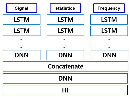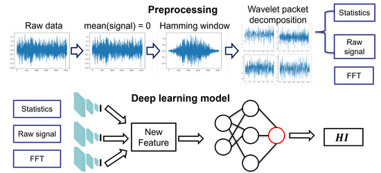 There also exist studies using a multi-domain input. These studies [7,14,29] obtain features using statistics as a time domain feature, FT as a frequency domain feature, and WT as a time–frequency domain feature. One study [20] obtained features in three domains, reducing the dimension through restricted Boltzmann machine (RBM), and predicting HI through gated recurrent units (GRU). Another study [19] did not use all three domains, resorting to statistics and raw signals in some cases, whereas two other studies [30,31] used a relevance vector machine (RVM) to construct a model, and predicted HI using statistics and a frequency domain feature, respectively.