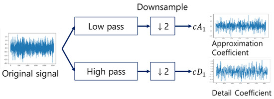 The equation W (p, q) presented below is an equation for WT. x(t) is the signal to apply WT, * (t) means a certain wavelet (mother wavelet), and * means a complex conjugate. Furthermore, p plays the role of reducing or increasing a certain wavelet as a scaling parameter, and q means a variable that moves a certain wavelet as a movement parameter. The formula DWT (discrete wavelet transform) (I, j) can be obtained from the dioxide of W (p, q); p and q are replaced by 2i and 2j, respectively. Repeated decomposition can be used to obtain low-frequency (cA1) and high-frequency (cD1) band signals, as shown in Figure 3.