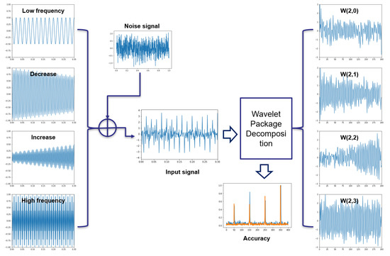 In particular, the resolution of WPD helps to detect a progressive increase in specific vibration caused by the growth of cracks in rotating components. Figure 5 shows the advantage of WPD in estimating the RUL. The input signal data are made by combining narrow, low signal, decreasing signal, increasing signal, wide high-frequency signal, and random noise signal in several different frequencies. The result of WPD maintains the trends of each signal, even though the noise signal is mixed. The accuracy of WPD’s resolution is evaluated with the result of the FFT filter and the DC-removing filter. Orange peaks cover the blue peaks of the original signal, as shown in Figure 5.