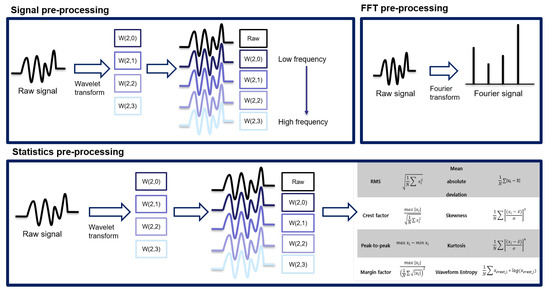 A survey sensor-data-driven approach is required for the preprocessing of sensor signals, wherein vibration signals are analyzed using various signal processing techniques. Preprocessing is performed on three main domain features: the time domain feature, the frequency domain feature, and the time–frequency domain feature. In the case of time domain features, various statistics have been widely used to efficiently capture bearing failure signals. Typically, statistical features, such as root mean square (RMS) and kurtosis, which describe the overall bearing failure process, are used. However, the main drawback is that these features do not describe the detailed failure steps. In the second case, frequency domain features are mainly analyzed by transforming time domain signals, such as Fourier transform (FT) and Hilbert–Huang transform into the frequency domain. The advantage of these features is that the technology is known to efficiently perform the steps of initial failure and final failure. However, their disadvantage resides in failing to describe the procedure for intermediate failures. Finally, time–frequency domain features are analyzed based on short-time Fourier transform (STFT) and wavelet transformation (WT). These transformation features are known to generate fewer errors and eliminate the loss of information [7].