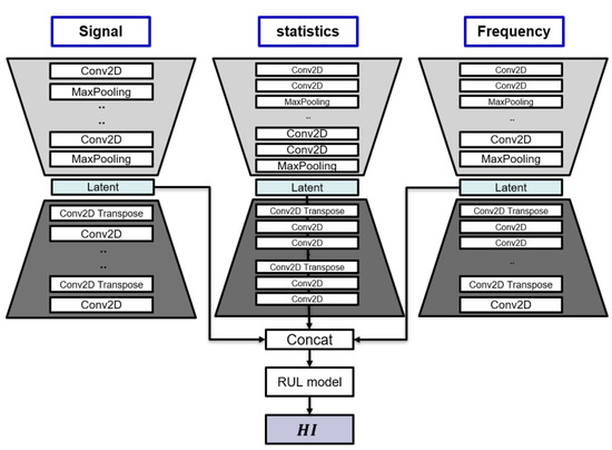 In the final analysis, all methods described in the methodology above are used to provide a new model, FEAE. Firstly, we proceed with the ensemble of input data. The structure shown in Figure 7 is used to efficiently compress and extract the information that each input data bears. This structure is a model based on three AEs, and each model uses a feature set of three regions as input values. Each feature set represents the input data of signal, statistics, and frequency, as described above. Additionally, the latent space of each AE is connected to the RUL model that predicts HI. The AE and RUL models consist of one stage, that is, one model.
