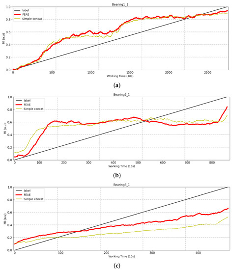 - Bearing2_1: The same aspect is shown as in the case of Bearing1_1; however, there are a few differences. The simple concatenate model shows an increase in the initial state, whereas the FEAE model does not. It can also be seen that the FEAE model demonstrates even better predictive performance as regards the final HI predictive value.