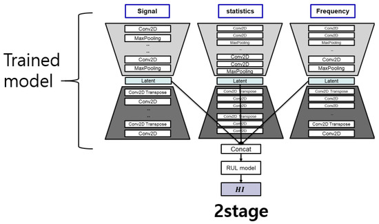 Learning the RUL prediction model using the latent space of trained AE as an input feature is common to both models (one stage and two stages). However, the difference between both models is that, when using a trained AE, the AE and the RUL prediction models are trained. In the case of the one-stage model (FEAE), the latent space is trained by two loss functions that are the loss functions of the AE and RUL prediction models, respectively. The two loss functions efficiently learn the latent space of each AE through the backpropagation method, which is a deep learning method, and at the same time, the final output of the model has better prediction performance of HI. However, in the case of the two-stage model, the models that predict AE and HI performing feature extraction are expected to show poor performance, since they are trained separately.