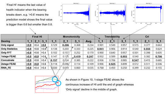 As shown in Figure 17, as a result of comparing the seven models, the health indicators of the first bearing, which are constantly damaged, all reached 0.8 or higher. On the other hand, in the case of the second bearing, abnormal vibration occurred in the middle, so it was difficult to accurately detect when only single feature was used, and a high health indicator was measured when the proposed FEAE was used. Finally, the third is a case in which the breakage occurred suddenly in the final stage, and only the model using only raw signal data showed its health indicator was close to 0.8. However, in the case of using the raw signal, a low score appeared in the monotonicity because the health indicator fell down in the final stage. This phenomenon is recognized as a failure before its actual breakdown. It means that the bearing cannot be used until a sufficient end life. In terms of monotonicity, in the comparison of the average of the three bearings, FEAE shows the highest scores and received overall good scores in trendability and critical factor scores too.