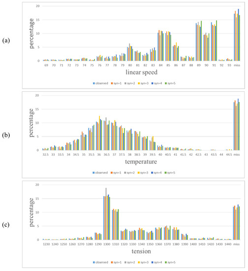 Three variables, linear speed (a), temperature (b) and tension (c) were selected for the distribution comparison between synthesis data and real one-month data.
