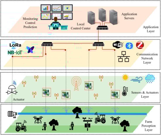 This section presents the complete IoT-based architecture for smart farming [20,21]. The proposed architecture consists of four layers: farm perception layer, sensors and actuators layer, communication network layer, and application layer, as shown in Figure 1.