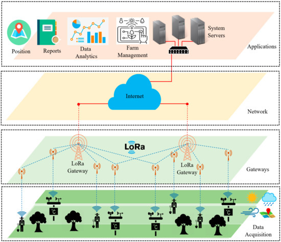 The main function of the communication network layer is to enable data transmission from the farm perception layer to the application layer based on different long-range and short-range communication technologies. Such solutions include wired (Ethernet) and wireless (ZigBee, Bluetooth, Wi-Fi, 3G/4G, LoRa, NB-IoT, Sigfox) communication technologies that are used to exchange data with the help of field gateways distributed in the field. Other network equipment includes network switches, routers, gateways, and base station infrastructures.