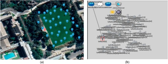 The LoRa communication network model is evaluated through simulation. The simulation models are based on the Open Source (Framework for LoRa) FLoRa Simulator, which is a simulation tool based on OMNeT++ [23,24,25]. FloRa Simulator includes different modules that simulate LoRa physical layer, LoRaWAN, gateways, and network servers. In FloRa, all the transmission parameters of the physical layer could be configured, such as the transmission power, code rate, bandwidth, center frequency, and spreading factor. Figure 3 shows the configured network topology for sensor nodes located in the playfield of the Universidad Técnica Federico Santa María (UTFSM) campus, Valparaiso, Chile.