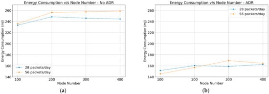 The energy consumption for LoRa networks is defined as the accumulated energy consumption of every node in the network in millijoule (mJ). The ADR-disabled case shows similar results of power consumption for different packet frequency (28 and 56 packets) with a different number of sensor nodes (100, 200, 300, and 400). The energy consumption values did not show a significant difference in terms of the number of nodes in the network. Compared to the case with ADR-disabled, ADR-enabled communication schemes achieve better results with lower power consumption. Figure 5a,b show the results of the energy consumption for end nodes.