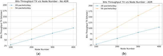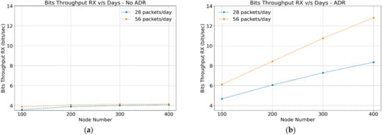 The reception throughput corresponds to all the acknowledgment and control messages perceived by the gateway, which are sent to the end devices, as shown in Figure 6a,b. The transmission throughput corresponds to all the data flow that the gateway perceives and is forwarded to the network server, which corresponds to the data packets transmitted by the end devices. Both scenarios (ADR-enabled and ADR-disabled) are very similar, as shown in Figure 7a,b. This confirms that networks operating with or without the “ADR” mechanism transmit the same amount of data.