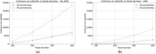 The collision metric is defined as the number of perceived collisions concerning the gateway. As shown in Figure 8a,b, there is a noticeable reduction in collisions in the case of ADR-enabled networks. The ADR-enabled mechanism helps in providing better energy usage, a higher reception throughput, and fewer collisions.