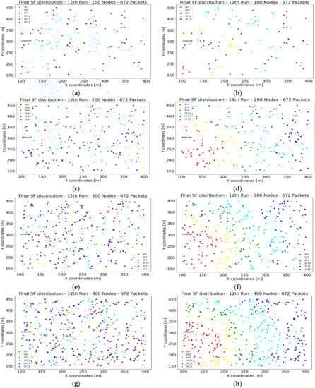 SF distribution with different number of sensor nodes: (a) 100 nodes ADR-disabled; (b) 100 nodes ADR-enabled; (c) 200 nodes ADR-disabled; (d) 200 nodes ADR-enabled; (e) 300 nodes ADR-disabled; (f) 300 nodes ADR-enabled; (g) 400 nodes ADR-disabled; (h) 400 nodes ADR-enabled.