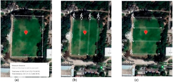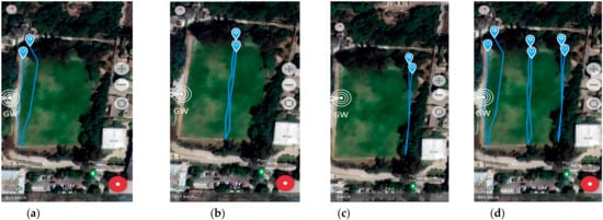 Figure 10a shows the satellite map for the experimental scenarios for the Farm Trackers. The GPS LoRa nodes setup is implemented and tested on the playfield located around the coordinates 33°02′05.3″ S 71°35′38.5″ W of the UTFSM campus. The total area is about 6705 m2. The playfield is covered with grass and surrounded by trees and buildings. There are no obstacles (e.g., buildings, trees) in the intermediate terrain. The location of the LoRa gateway (Dragino DLOS8) is shown in Figure 10b,c. This is an outdoor LoRaWAN gateway which includes a 1 × SX1301 + 2 × 1257 LoRa transceiver. Table 3 shows the technical specifications for the Dragino DLOS8 LoRa Gateway [27].