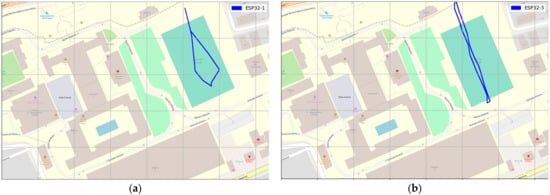 The measurement was collected using GPS LoRa nodes (ESP32 TTGO GPS NEO6 board). In the backside of the module, there is a battery holder for a Li-Ion battery which enables the portable operation of the nodes. The GPS LoRa nodes are named: ESP32-1, ESP32-2, ESP32-3, ESP32-4, and ESP32-5. The node ESP32-2 had a problem during the experiment and was not considered for data collection. Smart mobile devices used are smartwatch (D1), LG K41S (D2), Samsung S20 (D3), and Xiaomi POCO F3 (D3). The measurements were collected by four people. Each person ported a GPS LoRa node (ESP32 TTGO GPS NEO6) and a mobile device with Geo Tracker Mobile APP. The four persons start moving simultaneously and in the same direction. Table 5 shows the parameter settings for the GPS LoRa nodes. The measurements were collected using four LoRa nodes (ESP32-1, ESP32-3, ESP32-4 and ESP32-5). Figure 11 and Figure 12 show the movement direction and routes for scenario 1 and scenario 2, respectively, using the Geo Tracker Mobile APP.