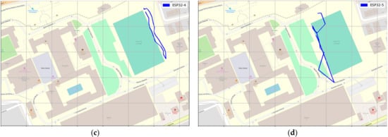 GPS results for Scenario 2 movement direction and route using LoRa GPS Nodes (a) ESP32-1 (b) ESP32-3 (c) ESP32-4 (d) ESP32-5.