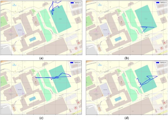 GPS LoRa results for Scenario 1 movement direction and route using LoRa GPS Nodes (a) ESP32-1 (b) ESP32-3 (c) ESP32-4 (d) ESP32-5.