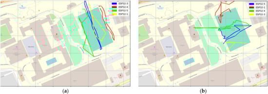 Aggregate GPS results for Scenario 1 movement direction and route using LoRa GPS nodes (a) Scenario 1 movement direction and route (b) Scenario 2 movement direction and route.